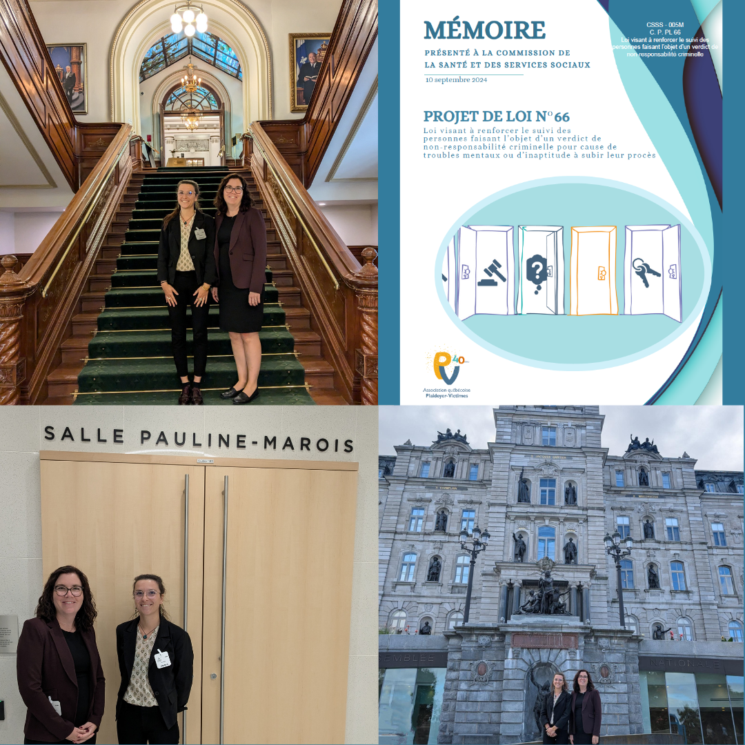« L’AQPV salue ce projet de loi qui est un premier pas important. Cependant, il est préoccupant de constater que les personnes victimes, leurs droits et leur sécurité ne sont pas mentionnés explicitement. Cela contribue à les invisibiliser. Pourtant, le projet ne concerne-t-il pas justement les personnes victimes d’infractions criminelles? L’Association recommande d’intégrer systématiquement le point de vue de la personne victime à toutes les étapes du processus afin d’assurer une évaluation complète du risque de dangerosité que représente une personne ISP* ou NCR*, et ainsi, garantir sa sécurité. 𝐏𝐚𝐫𝐜𝐞 𝐪𝐮𝐞 𝐜𝐡𝐚𝐪𝐮𝐞 𝐝𝐞́𝐜𝐢𝐬𝐢𝐨𝐧 𝐨𝐮 𝐚𝐜𝐭𝐢𝐨𝐧 𝐚𝐮𝐫𝐚 𝐮𝐧 𝐢𝐦𝐩𝐚𝐜𝐭 𝐬𝐮𝐫 𝐥𝐚 𝐩𝐞𝐫𝐬𝐨𝐧𝐧𝐞 𝐯𝐢𝐜𝐭𝐢𝐦𝐞 ». Karine Mac Donald, directrice générale de l’AQPV.